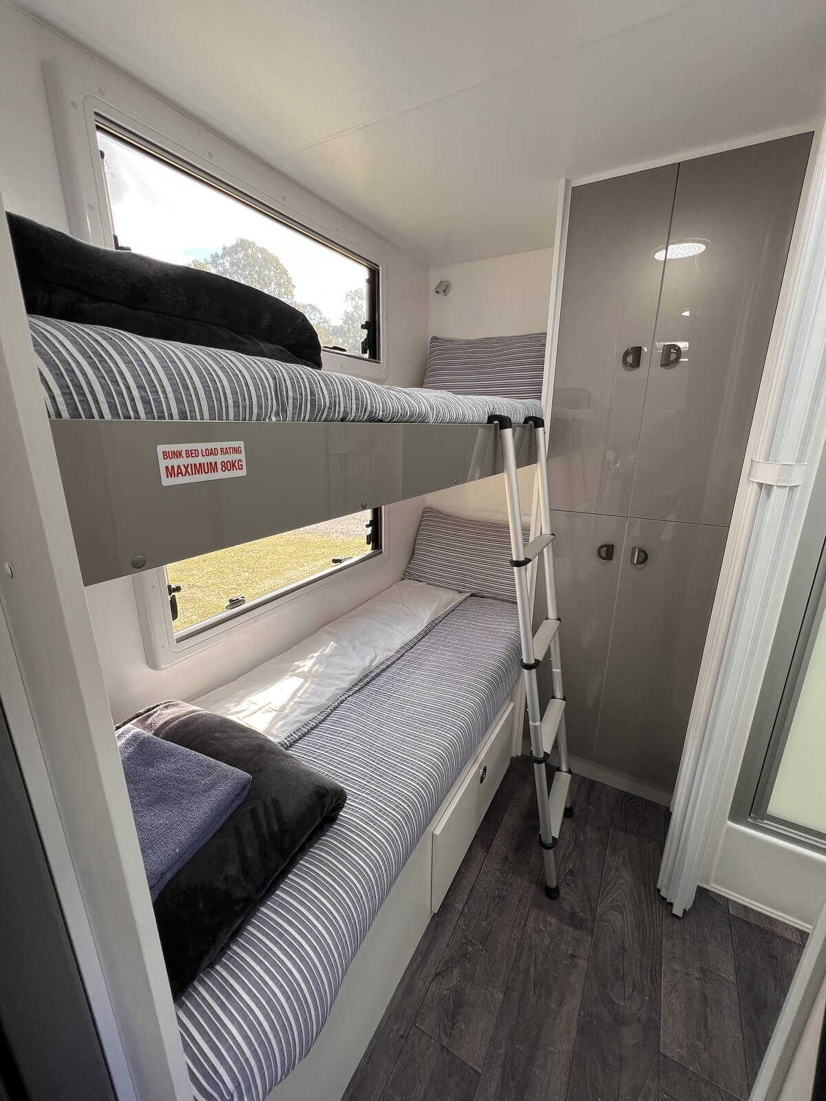 • Two fold out double beds and single bunks – sleeps 5 (ideal for 2 adults and 3 children)